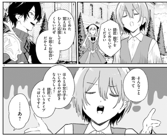 [Oh, alright. Shishou, are you the type of person who tends to pick on the girl you like? I just get that feeling from you after hearing what you said.] (K)