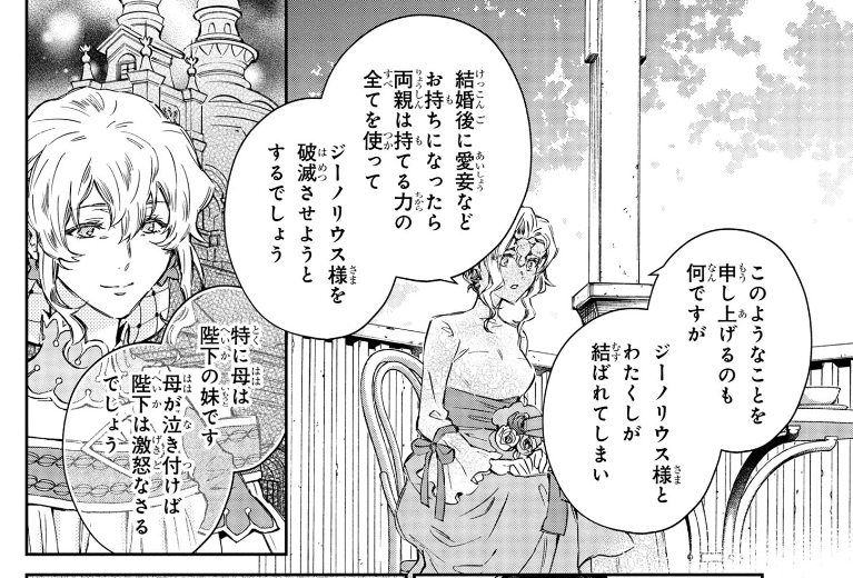 [While it is embarrassing for myself to say this, my parents do love and dote on me too much. If we end up married together and find yourself a mistress thereafter, my parents will definitely use all their powers to bring you and your whole family down. That’s very likely, especially my mother’s the younger sister of his majesty the king. And she’s not just a normal sibling, the king practically transforms when it comes to my mother. My mother cried once and you won’t be able to imagine how furious the king was and what he did for her! So, Genorious-sama, if you wish to engage in another relationship without fearing the destruction of you and your family, then you’d have to wait until the power balance between our families turn upside down. Which is, realistically speaking, would require for the king to abdicate his throne in around twenty or so years.]
