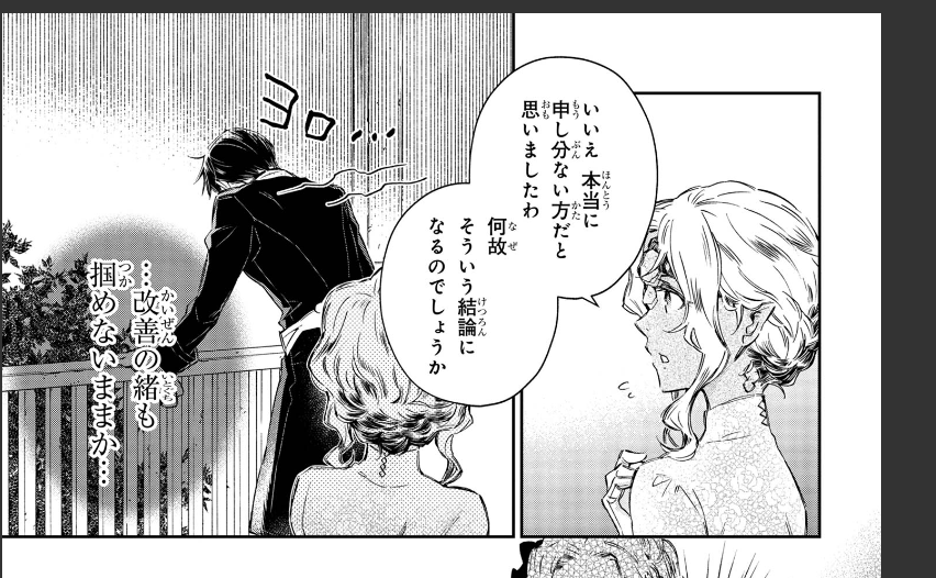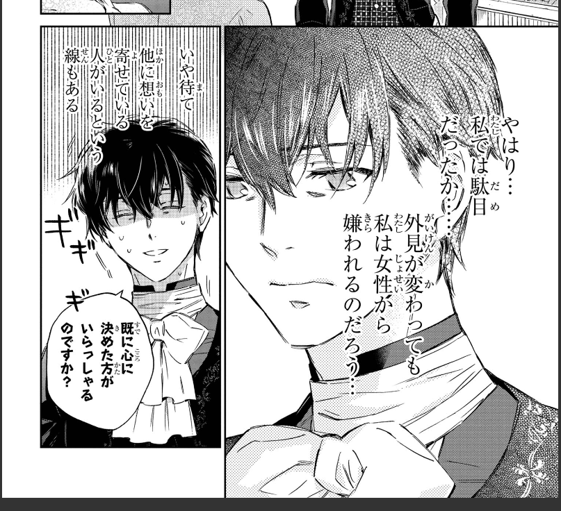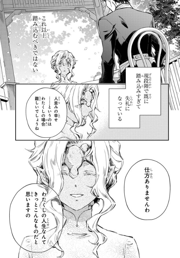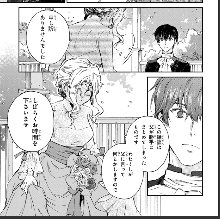 [I appreciate your thoughts but there’s nothing I can do about this, ain’t it? *giggles* Just take a look at me, Generious. I look hideous. Would you really want to be married to someone with this appearance? I have a powerful family behind me too. If you’ll be adopted in the duke’s family as a son in law, it’ll be practically impossible for you to meet and comfort yourself with another woman. I am quite aware that it’ll be nothing but a death sentence for any man to end up as my husband.]