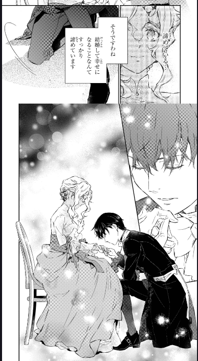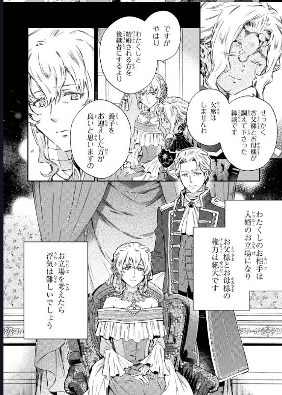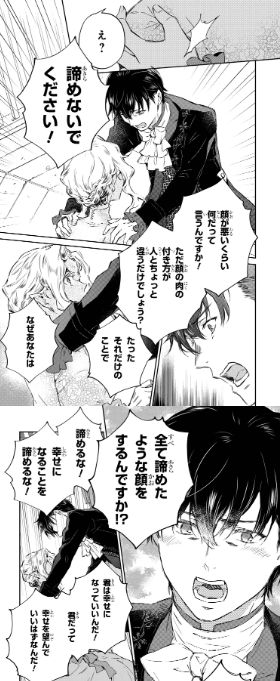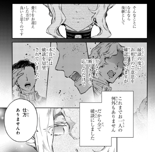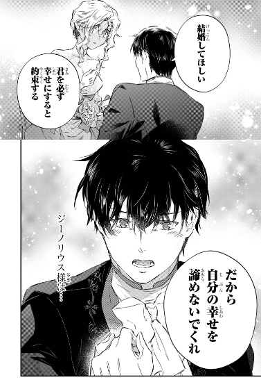[I appreciate your thoughts but there’s nothing I can do about this, ain’t it? *giggles* Just take a look at me, Generious. I look hideous. Would you really want to be married to someone with this appearance? I have a powerful family behind me too. If you’ll be adopted in the duke’s family as a son in law, it’ll be practically impossible for you to meet and comfort yourself with another woman. I am quite aware that it’ll be nothing but a death sentence for any man to end up as my husband.]